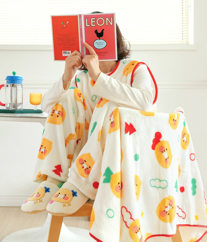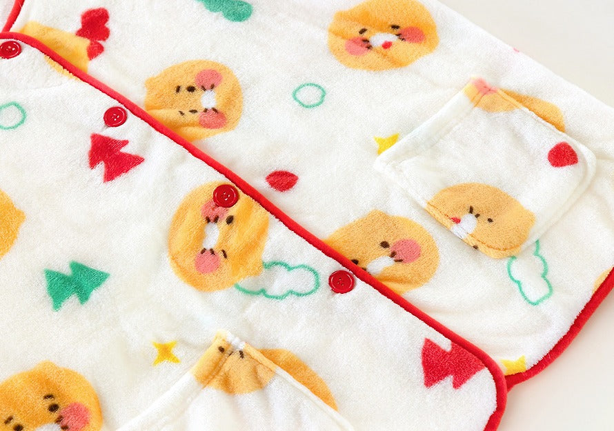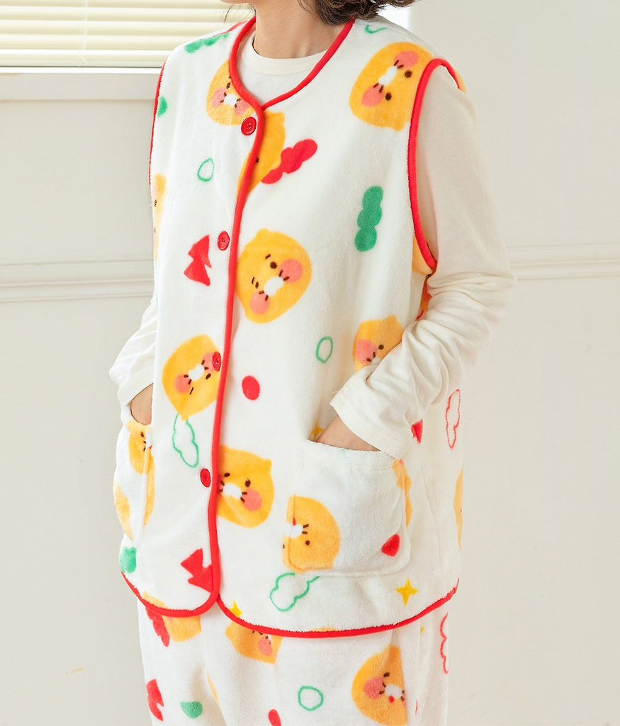 A soft and warm sleeveless fleece vest featuring the Chunsik and Ryan character pattern.Perfect for indoor wear and lightweight comfort during cold seasons.